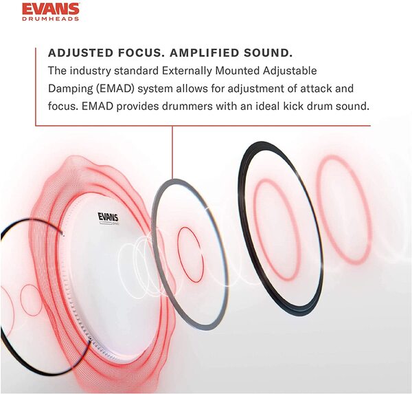 El cabezal de bombo de la serie EMAD se llama por el sistema de amortiguación ajustable montado externamente. Este sistema permite a cada jugador controlar el ataque y el enfoque de la cabeza del tambor eligiendo uno de los dos anillos de amortiguación de espuma extraíbles. Elegir el anillo de espuma más fino permite el golpe y el enfoque sin sacrificar la resonancia, mientras que elegir el anillo de espuma más ancho maximiza el extremo bajo y el ataque de cualquier bombo. El sistema EMAD está disponible en una variedad de opciones, incluyendo una sola y dos capas, y versiones claras y recubiertas para adaptarse a las preferencias de cada baterista.