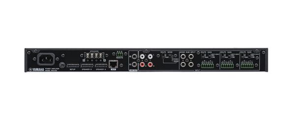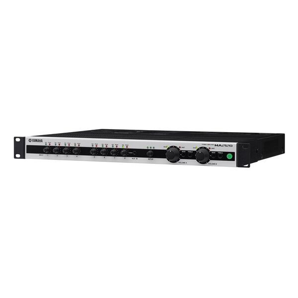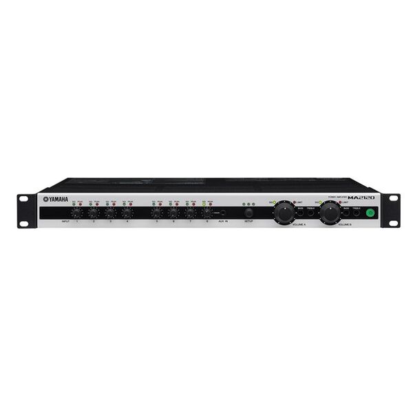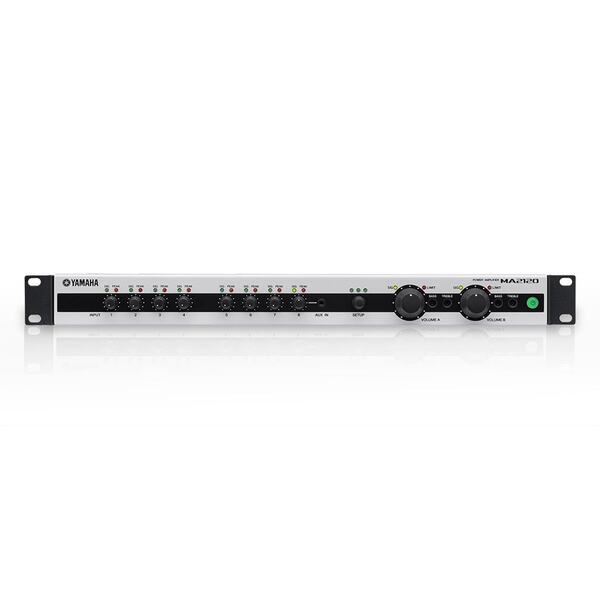 Amplificador-mezclador de clase D con selección de baja impedancia/alta impedancia (baja impedancia: 120 W x 2 @ 4 Ω, 100 W x 2 canales @ 3 Ω/8 Ω; alta impedancia: 120 W x 2 canales o 200 W x 1 canal, 70 V/100 V) , equipado con 6 entradas de micro/línea, 2 entradas de micrófono y potentes funciones DSP para reproducir música con gran calidad y utilizarlo con un micrófono.