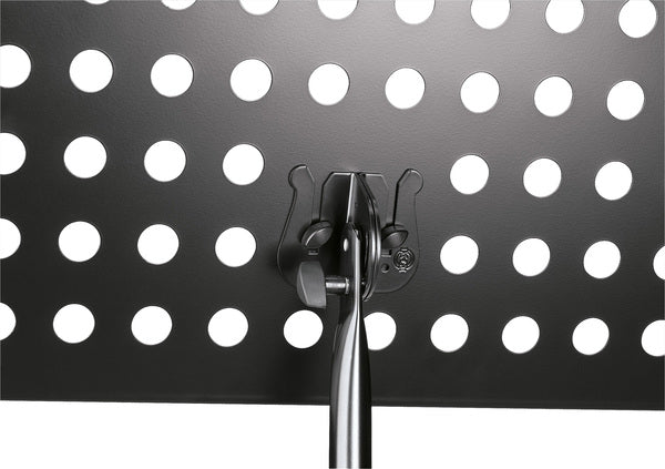 Base de bloqueo con patas de acero con perfil en U. Las patas son plegables para facilitar su transporte. Con un mecanismo de bloqueo especial en la base, las patas se bloquean firmemente, lo que hace que el soporte sea ultra estable. El escritorio de música de acero perforado extraíble se fija al soporte con 2 tornillos de bloqueo.