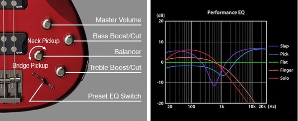 La serie TRBX300 dispone de controles de volumen general, balance de pastillas y ecualizador activo de 2 bandas con selector de ecualizaciones prefijadas (Performance EQ) para disponer de gran potencia y precisión a la hora de dar forma al sonido.