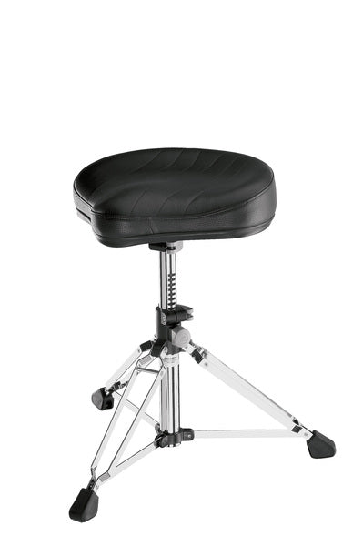 Base estable y plegable de 3 patas con tapas de goma grandes fijas para un buen contacto con el suelo y absorción de impactos. Ajuste de altura continuo mediante un sistema de muescas con pasos de 10 mm para un posicionamiento de altura rápido y preciso. El mecanismo de bloqueo de ajuste de altura cuenta con un cómodo botón de tiro y una práctica palanca de sujeción. Combinación de cañas muy resistente y única. El asiento desmontable cuenta con una innovadora brida de fundición. El asiento no se tambalea gracias a una palanca de sujeción que permite una rotación del asiento desde la posición suelta a la fija. El asiento ergonómico reduce la presión sobre los muslos del baterista. Confort perfecto gracias a la sofisticada tapicería de cuero sintético suave granulado negro de alta calidad. Como primicia mundial, el trono de este baterista tiene 4 enchufes roscados en la parte inferior del asiento para sujetar un ButtKicker.