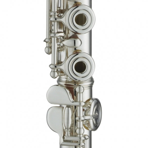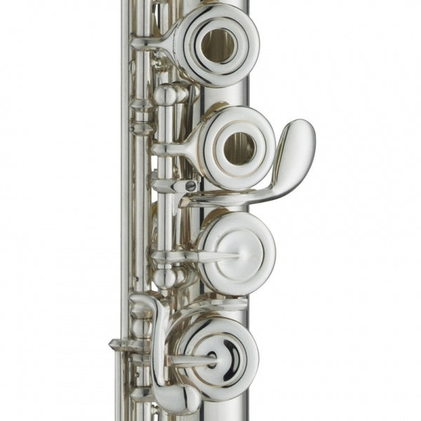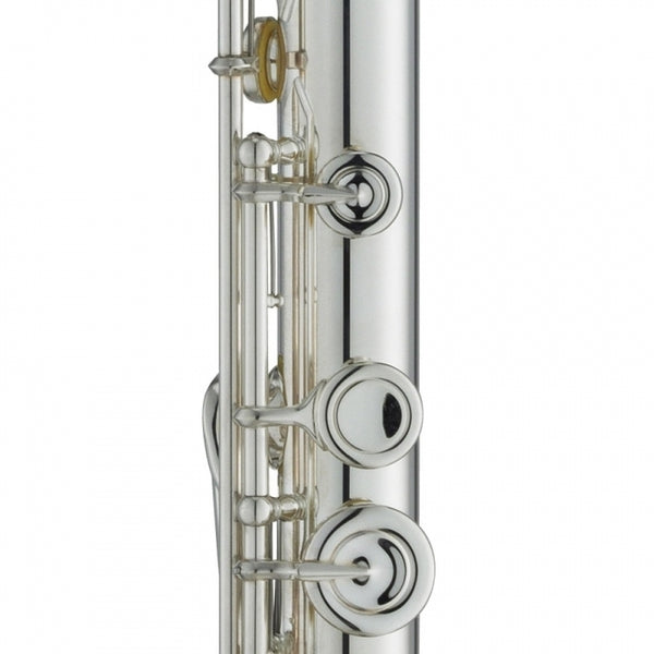 Flauta 577H profesional con Offset G, C # trill key, split E, gizmo key. Las flautas profesionales Yamaha 577H flautas profesionales combinan el brillo de un cuerpo de níquel plata con los característicos colores cálidos de una junta de cabeza de plata de ley. La cabeza, el cuerpo y la articulación del pie son tratados térmicamente con el proceso de recocido acústico patentado de Yamaha, para proporcionar una impresionante uniformidad de tono y respuesta en todos los registros. La cabeza de plata de ley acabada a mano es una versión modificada de la articulación tipo A suministrada con flautas hechas a mano Yamaha. El corte especialmente diseñado de esta articulación ofrece una respuesta increíble y una impresionante gama dinámica.Las teclas cuentan con brazos de llave puntiagudos tradicionales, reflejando el más alto nivel de artesanía y agregando elegancia visual a estos instrumentos sobresalientes.