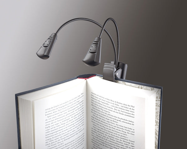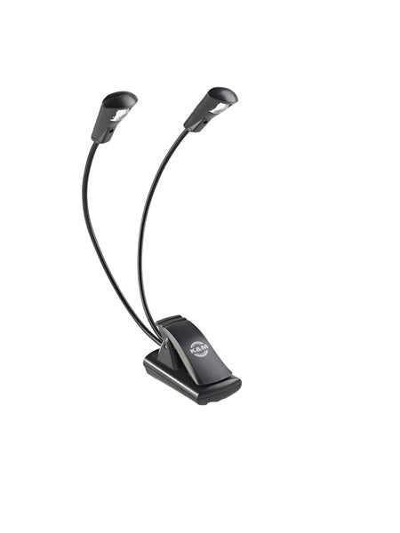Luz compacta y versátil de doble cabezal con 2 cuellos de cisne flexibles y con un LED duradero en cada cabezal. Los 2 LED se pueden encender individualmente y tienen una duración nominal de 100.000 horas. El clip práctico y extra ancho (hasta 25 mm) se fija a escritorios de música, tableros de mesa, etc. También se puede utilizar como luz de pie. Los cuellos de cisne son fáciles y compactos de doblar. Incluye 3 pilas (1,5 V AAA) con una duración de hasta 20 horas.