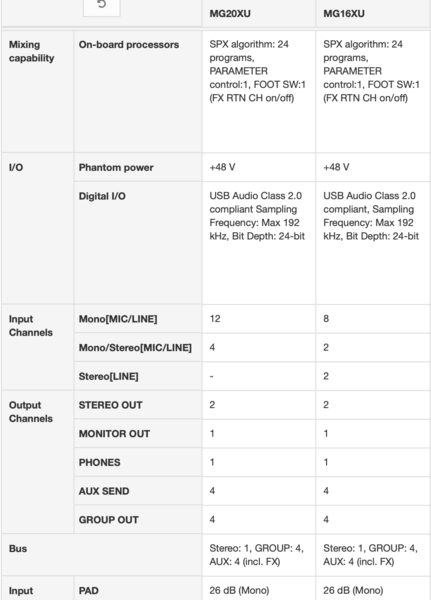 Mesa de mezclas de 20 canales: máximo 16 entradas de micro/20 de línea (12 mono + 4 estéreo); 4 buses de grupo + 1 bus estéreo; 4 envíos AUX (incluyendo envío para efectos).