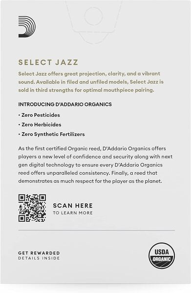 Como la primera caña orgánica certificada, D'Addario Organics ofrece a los jugadores un nuevo nivel de confianza y seguridad junto con tecnología digital de próxima generación para garantizar que cada caña de D'Addario Organics ofrezca una consistencia incomparable. Organic Select Jazz ofrece una gran proyección, claridad y un sonido vibrante. Disponible en modelos archivados y sin archivar, Select Jazz se vende en terceras concentraciones para una combinación óptima de boquillas.