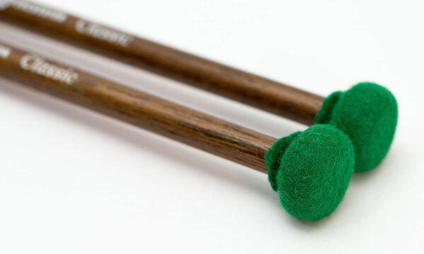 Fieltro verde sobre un pequeño núcleo de madera. Un palo articulado con tono y cuerpo. Funciona bien para pasajes de movimiento rápido que requieren un sonido claro.