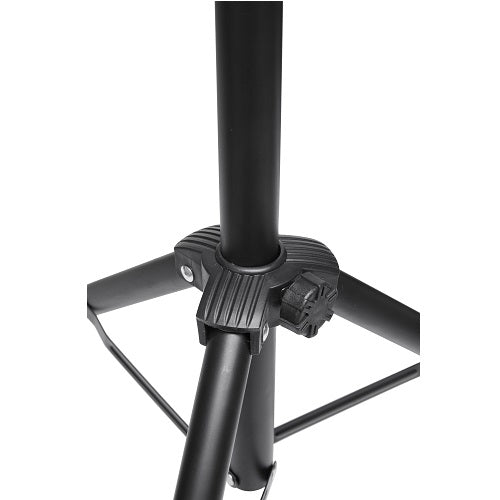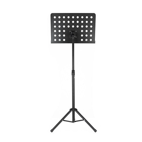 Soporte orquestal de metal macizo para notas plegables. Tiene una placa de metal que se puede quitar del soporte.