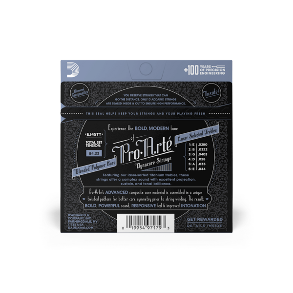La tensión normal EJ45TT es el set Dynacore más vendido de D'Addario, preferido por su equilibrio de tono rico y proyectado y sensación cómoda. Los conjuntos D'Addario Premium Pro-Arté DynaCore están construidos con nuestro exclusivo material de núcleo trenzado multifilamento con una técnica de enrollado revolucionaria. El resultado es un tono verdaderamente único y contemporáneo ... rico, redondo y lleno con una vida de cuerda dramáticamente mejorada, estabilidad de afinación y consistencia. Este conjunto se complementa con nuestros agudos de titanio (brillantes y proyectantes) para un equilibrio tonal óptimo.