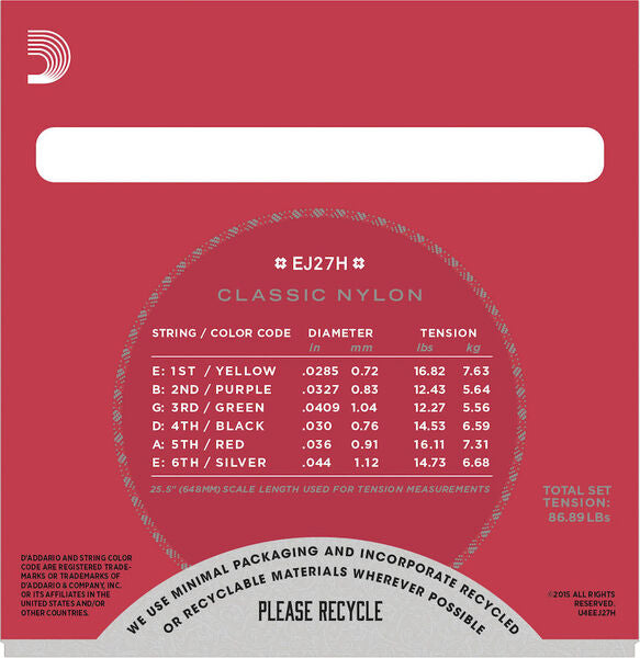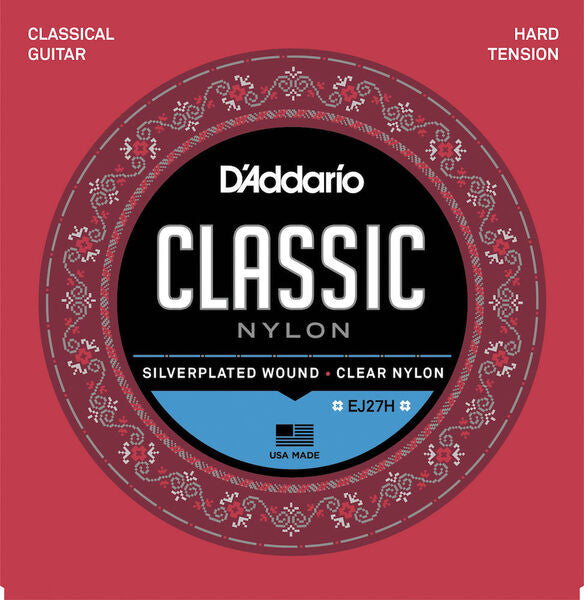 Las cuerdas para guitarra clásica EJ27H Classic Nylon de D'Addario son excelentes para principiantes, estudiantes y profesionales. Este juego de tensión dura contiene 3 agudos de nailon transparente y 3 graves entorchados en cobre y recubiertos en plata para brindar el equilibrio óptimo de tono cálido, con proyección y duradero. Cada juego cumple con las mismas normas estrictas que nuestros juegos profesionales, y los pueden utilizar bajistas que buscan un juego económico y confiable. El juego de tensión normal está disponible para guitarras clásicas de 1/2 y 3/4.
