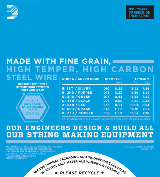 EXL110-7, el juego de 7 cuerdas más vendido de D'Addario, ofrece la combinación ideal de tono, flexibilidad y larga duración. El estándar para la mayoría de las guitarras eléctricas de 7 cuerdas.