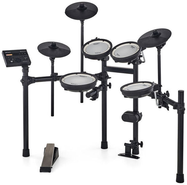 Compacto y de buen precio, pero con el tono, la sensación y las características profesionales para mejorar tu forma de tocar la batería rápidamente, el TD-07DMK es el punto de entrada a la serie V-Drums TD-07. Si bien los pads son más pequeños que los kits de rango superior, apreciará la sensación satisfactoria de la caja PDX-8 y los tres toms PDX-6A, todos con parches de malla de doble capa ultra silenciosos de Roland. Los platillos compactos CY-5 crash and ride te permiten tocar con expresión donde el espacio es reducido, mientras que un pad de bombo montado en un soporte ayuda a crear el tamaño más pequeño de la gama TD-07 para hacer el kit perfecto para el hogar.